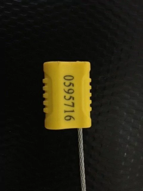 Precinto ajustable de cable de acero con mecanismo de cierre sin retorno, cuerpo metálico con cobertura plástica para registrar evidencias en caso de intento de violación.